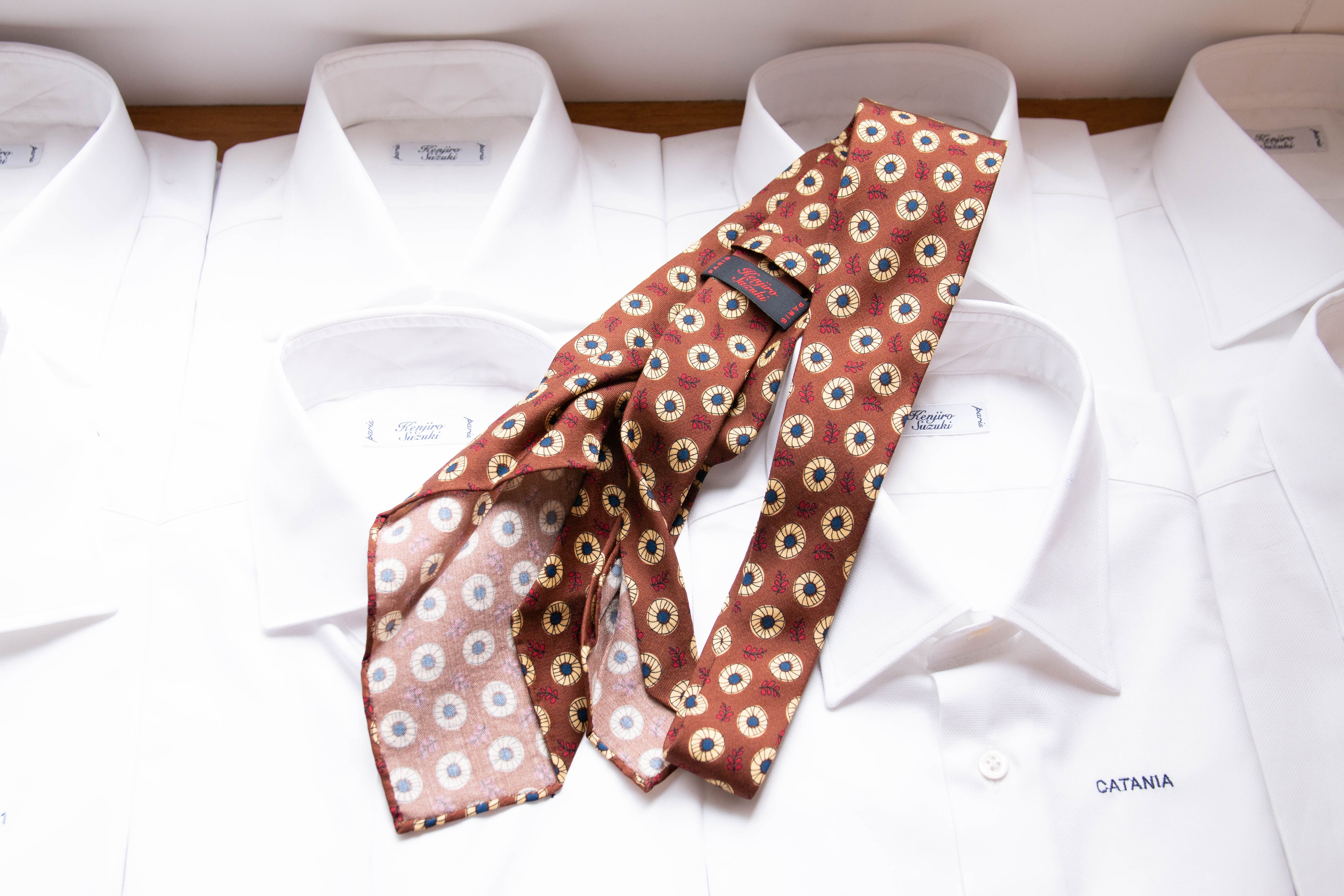 一般的なジャガード織りのタイより薄く仕上がり、裏地なしの5つ折りにすることでさらに軽く、やわらかく仕上がります。締めたときの気持ちよさは一度身につけると忘れられない独特のものです。