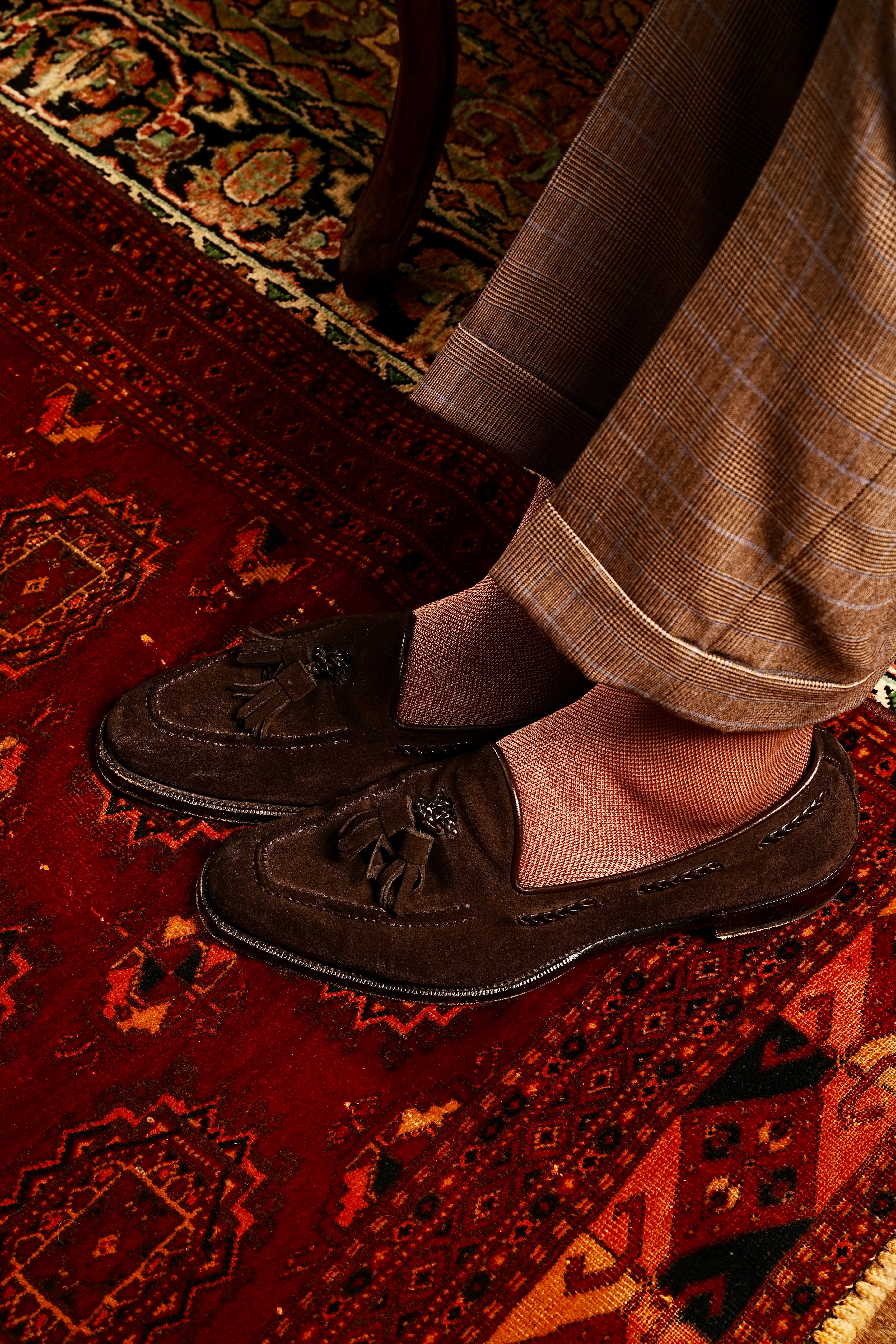 パンツから靴へのコーディネートの流れを色で繋げる役目を果たしてくれ、