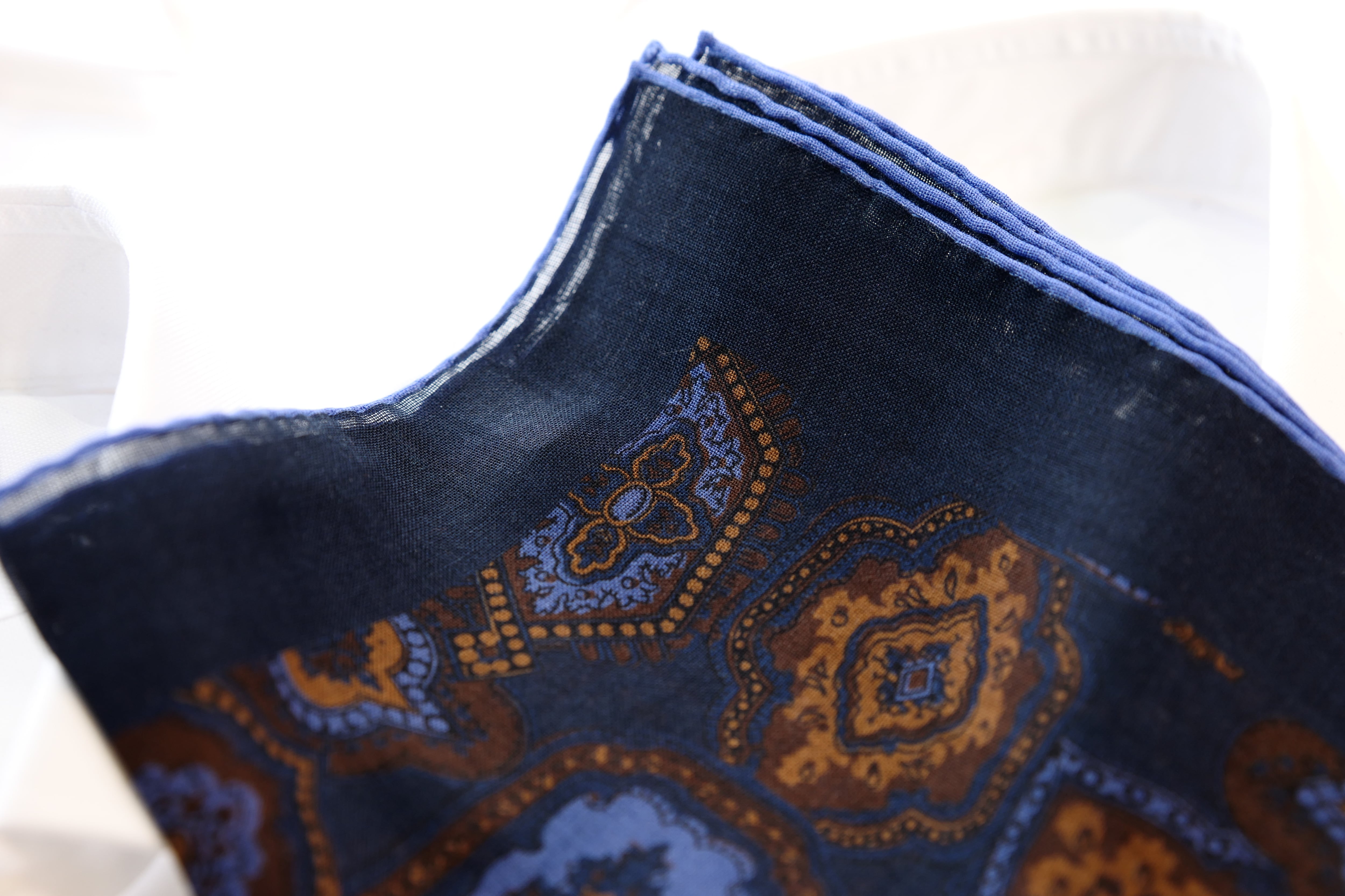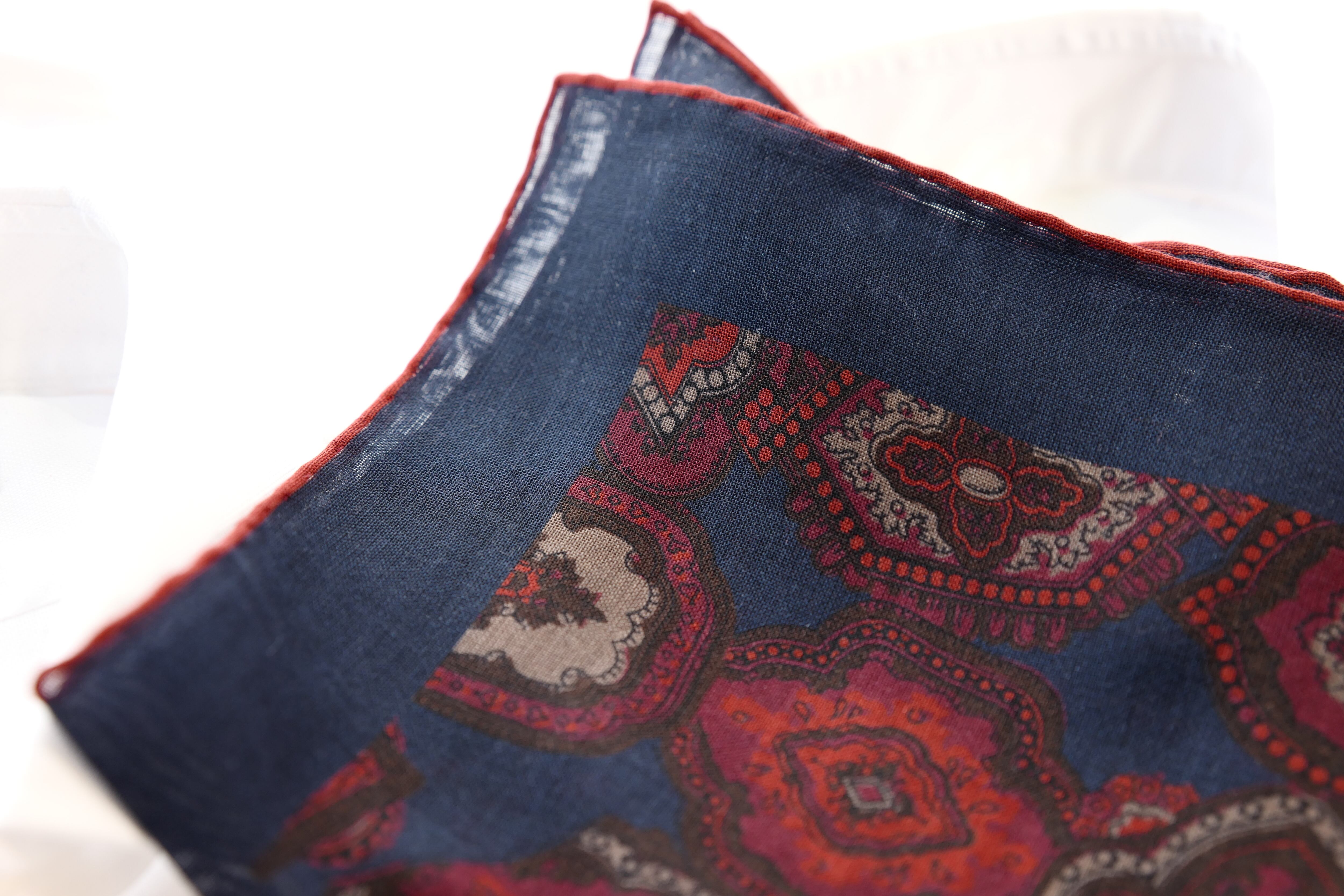 女性用のスカーフの様な柄ですが、マスキュランでありながら、どこかモダンに感じるポケットチーフです。