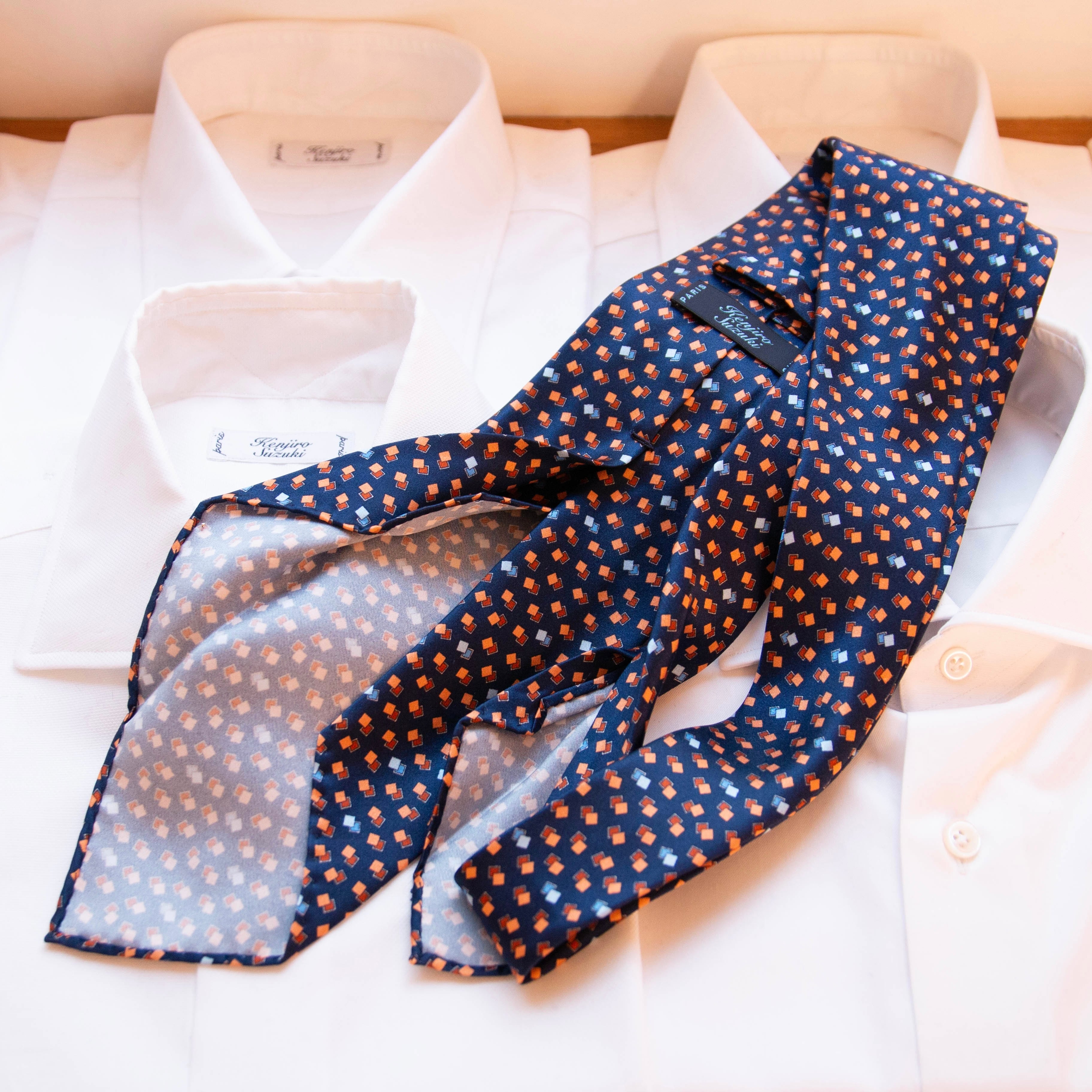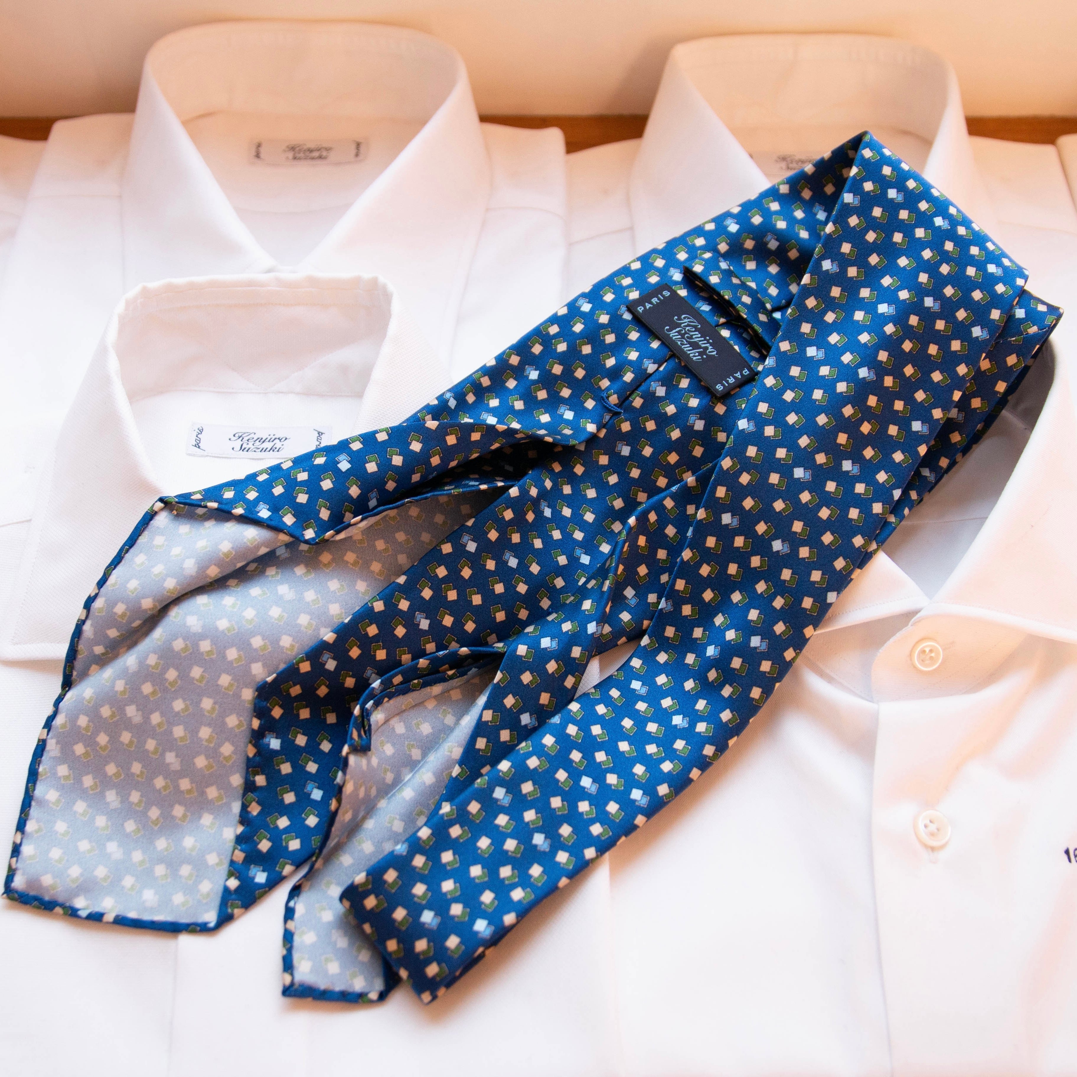 ネクタイと言えば一番種類が多いのはジャガード織りになりますが、KENJIRO SUZUKI Paris ではプリントタイを多く取り揃えております。織りで柄を表現するジャガードタイに対して、プリントタイは細かい柄や曲線を繊細に表現できるのが特徴です。