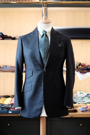 濃紺ベースに水色とグリーンのブロック柄。小さく、クラッシックな柄のため、写真のようなダークネイビースーツのとの相性は抜群です。