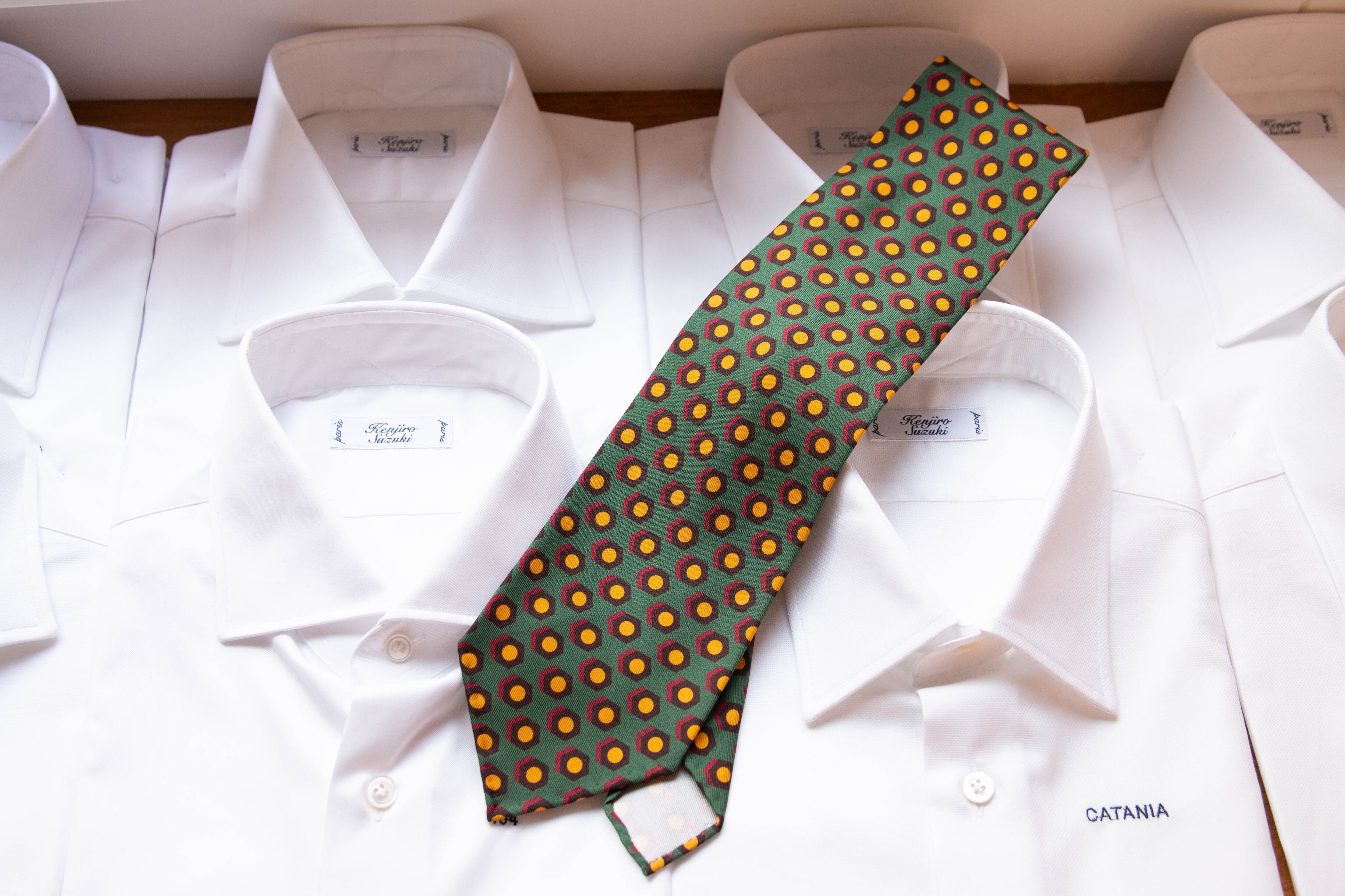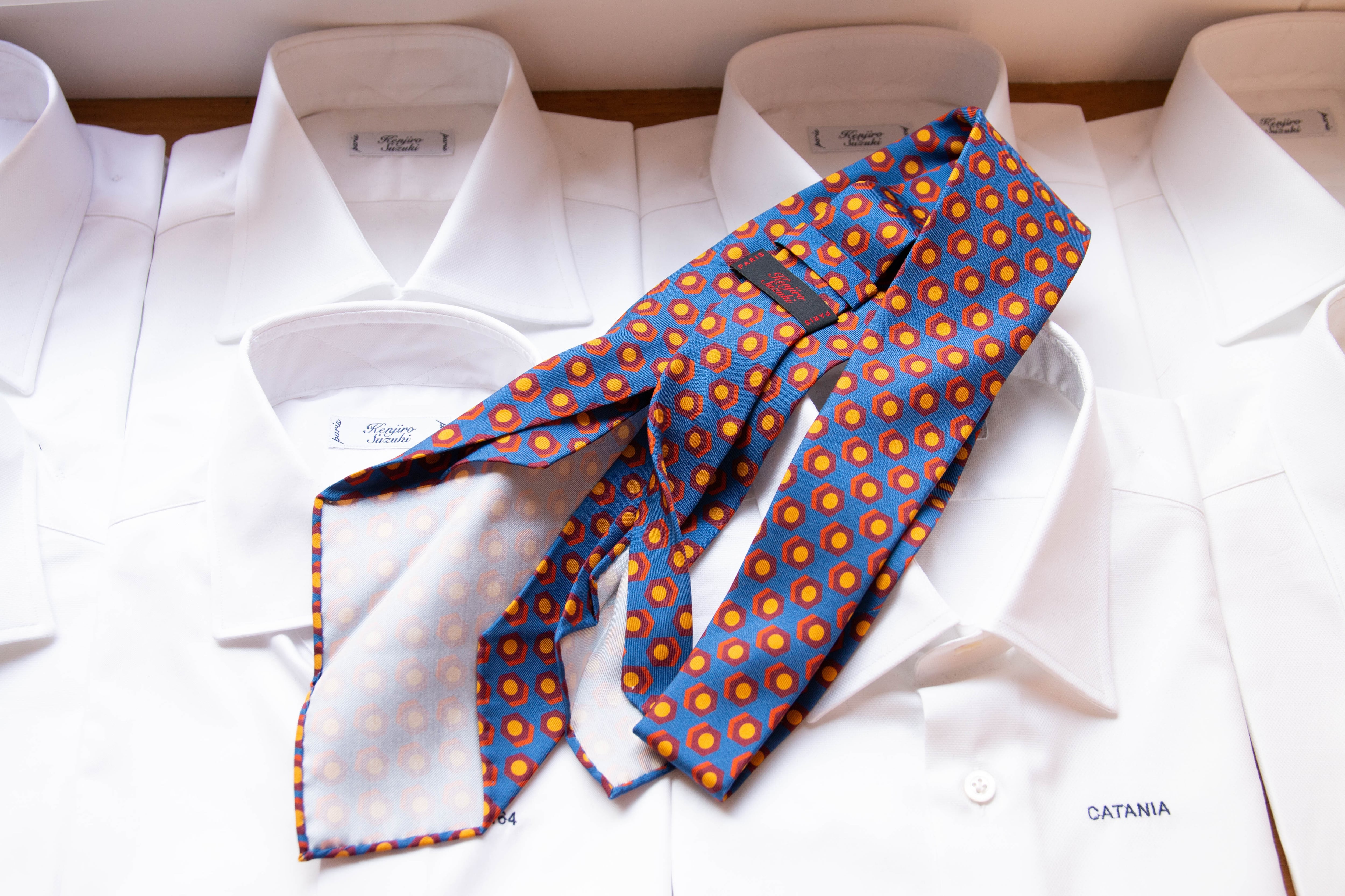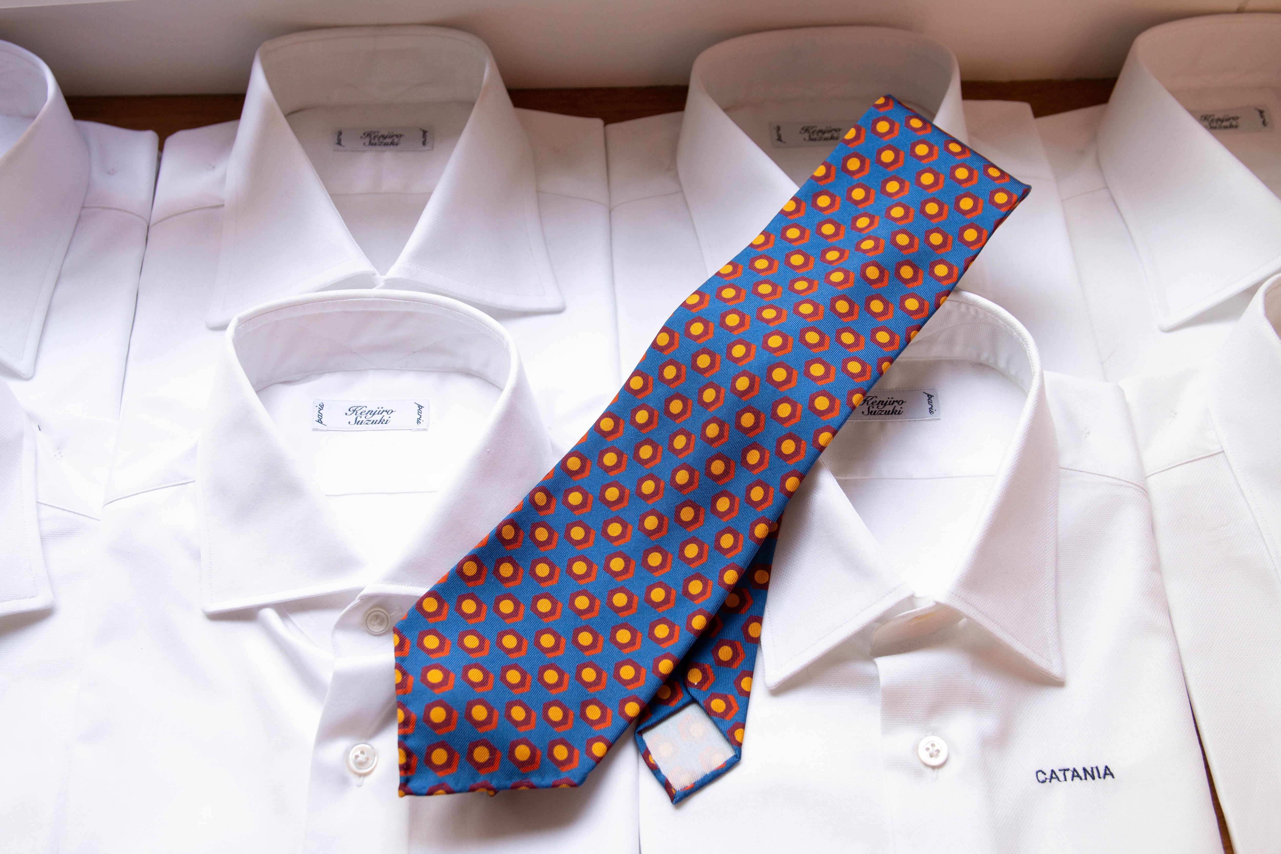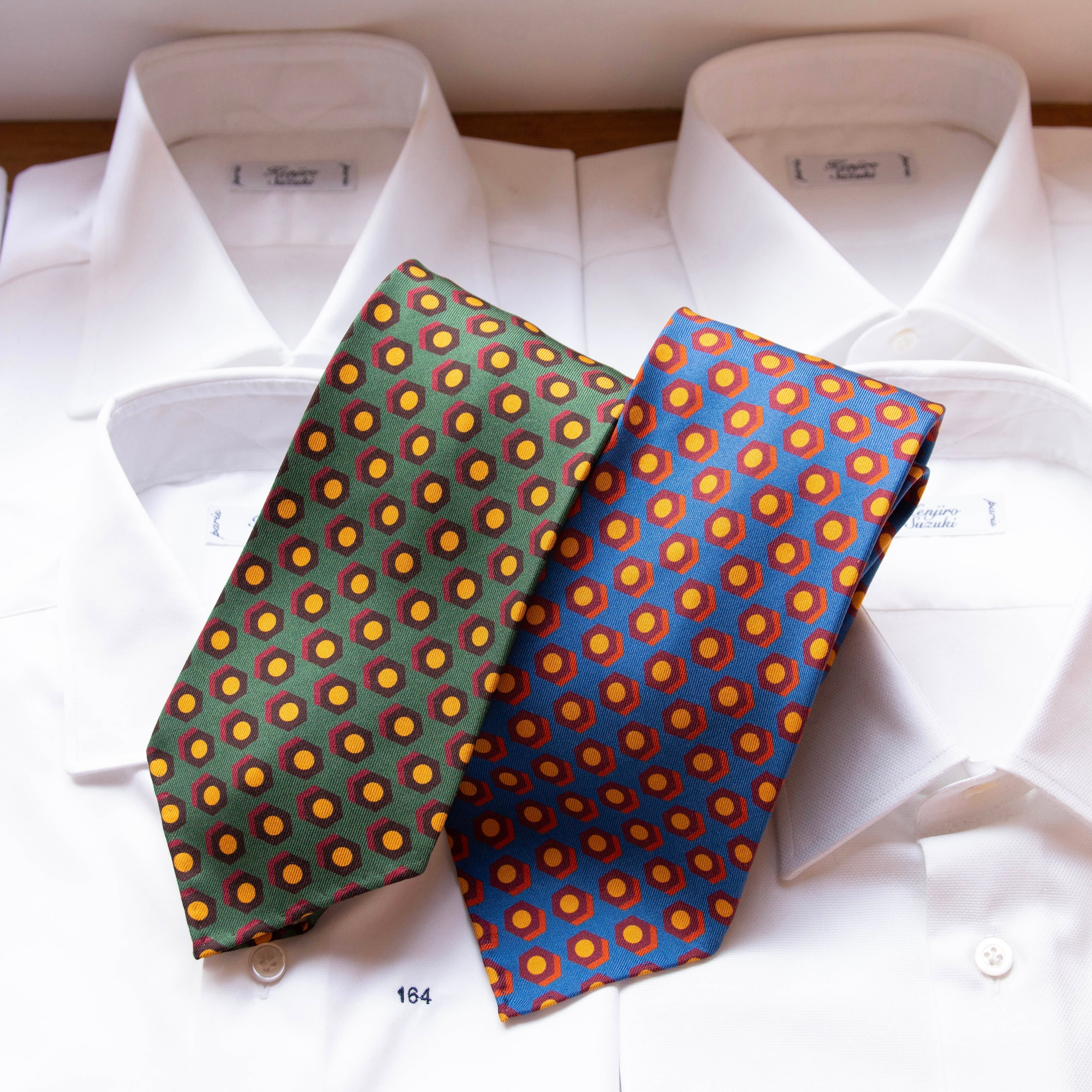 ネクタイと言えば一番種類が多いのはジャガード織りになりますが、KENJIRO SUZUKI Paris ではプリントタイを多く取り揃えております。織りで柄を表現するジャガードタイに対して、プリントタイは細かい柄や曲線を繊細に表現できるのが特徴です。