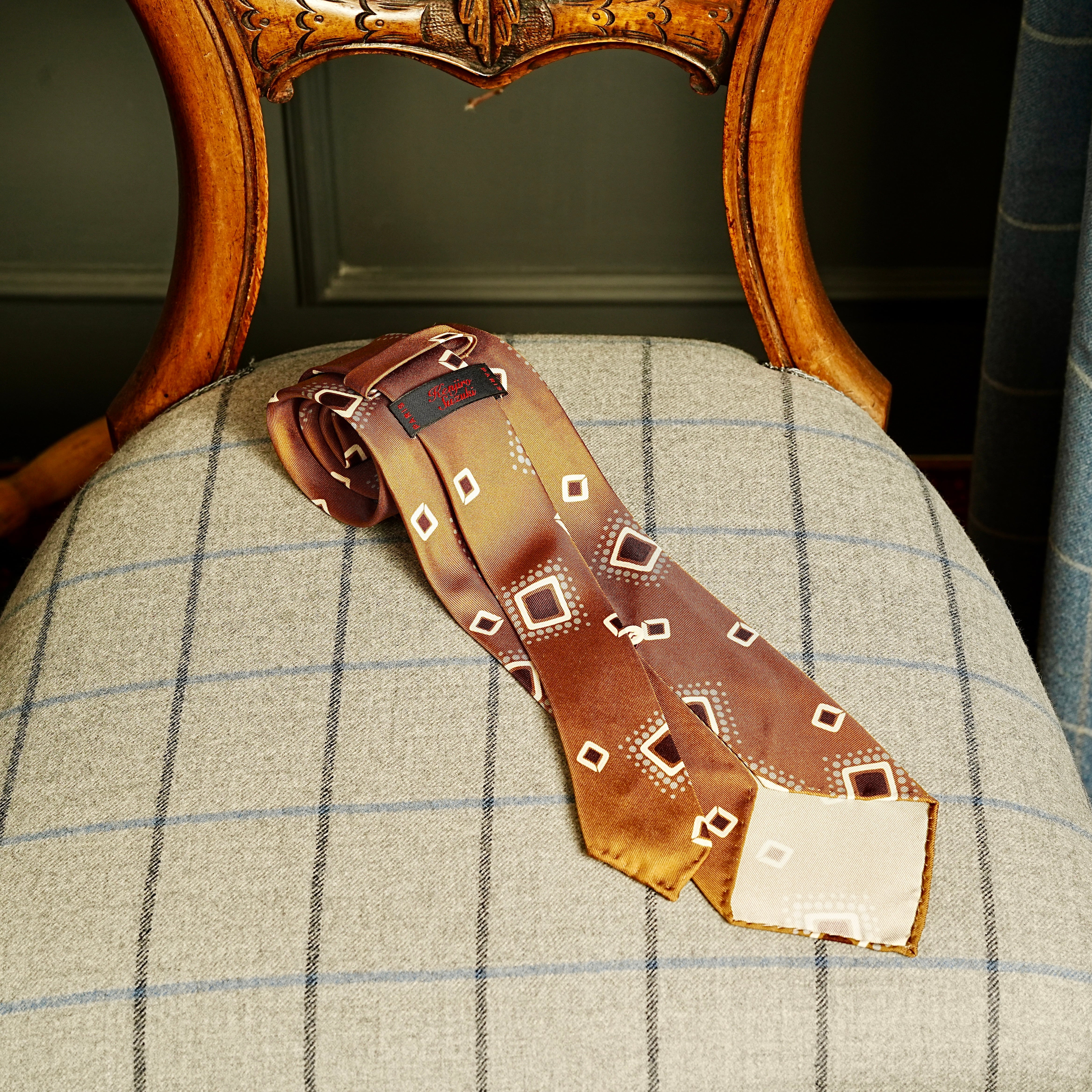 Printed tie silk 100% light brown based with a bold diamond pattern