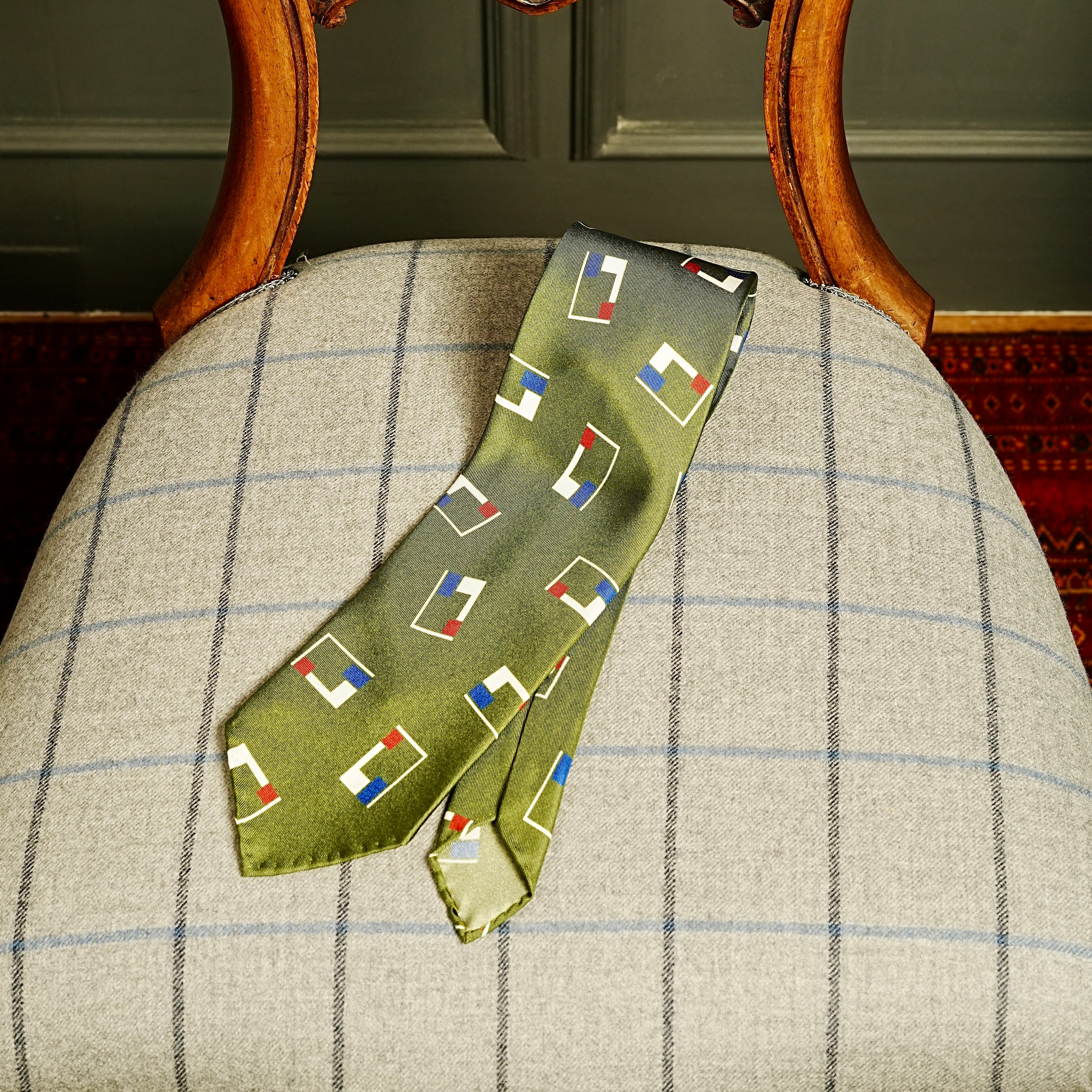 グリーンベースに少し大柄な幾何学模様は、着こなしをモダンで軽やかな印象にしてくれ、オシャレさがぐっとあがります。