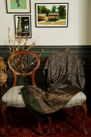 こちらでご紹介してるストールはヴィンテージのものと違い、ピュアシルクのダブルフェイスプリントになります。