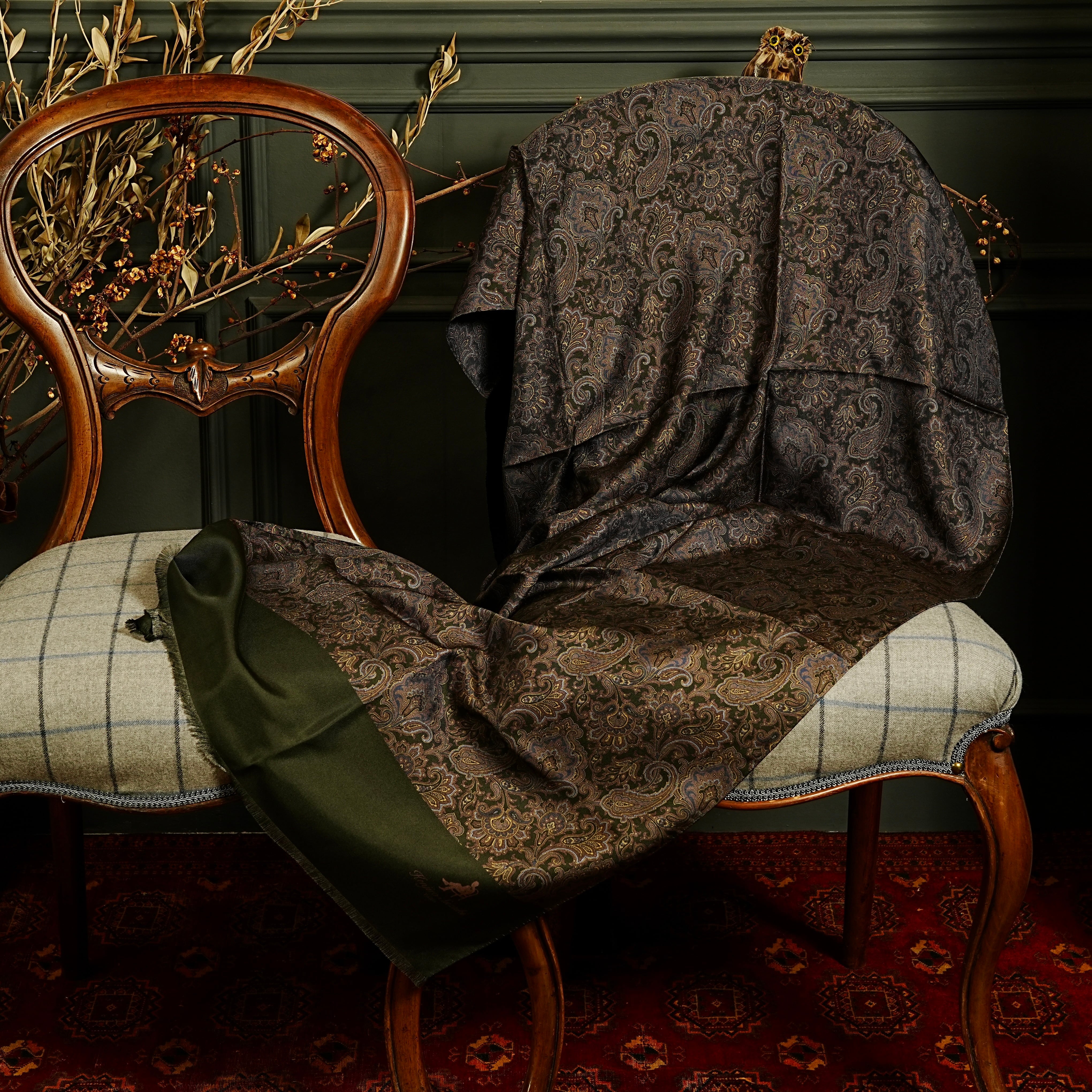 In Europe, silk stoles have long been a beloved accessory, once found in the finest vintage shops. Many of those vintage examples, often from the 1960s to 1980s, feature charming small motifs or paisley prints but are typically made of rayon or stiff polyester.