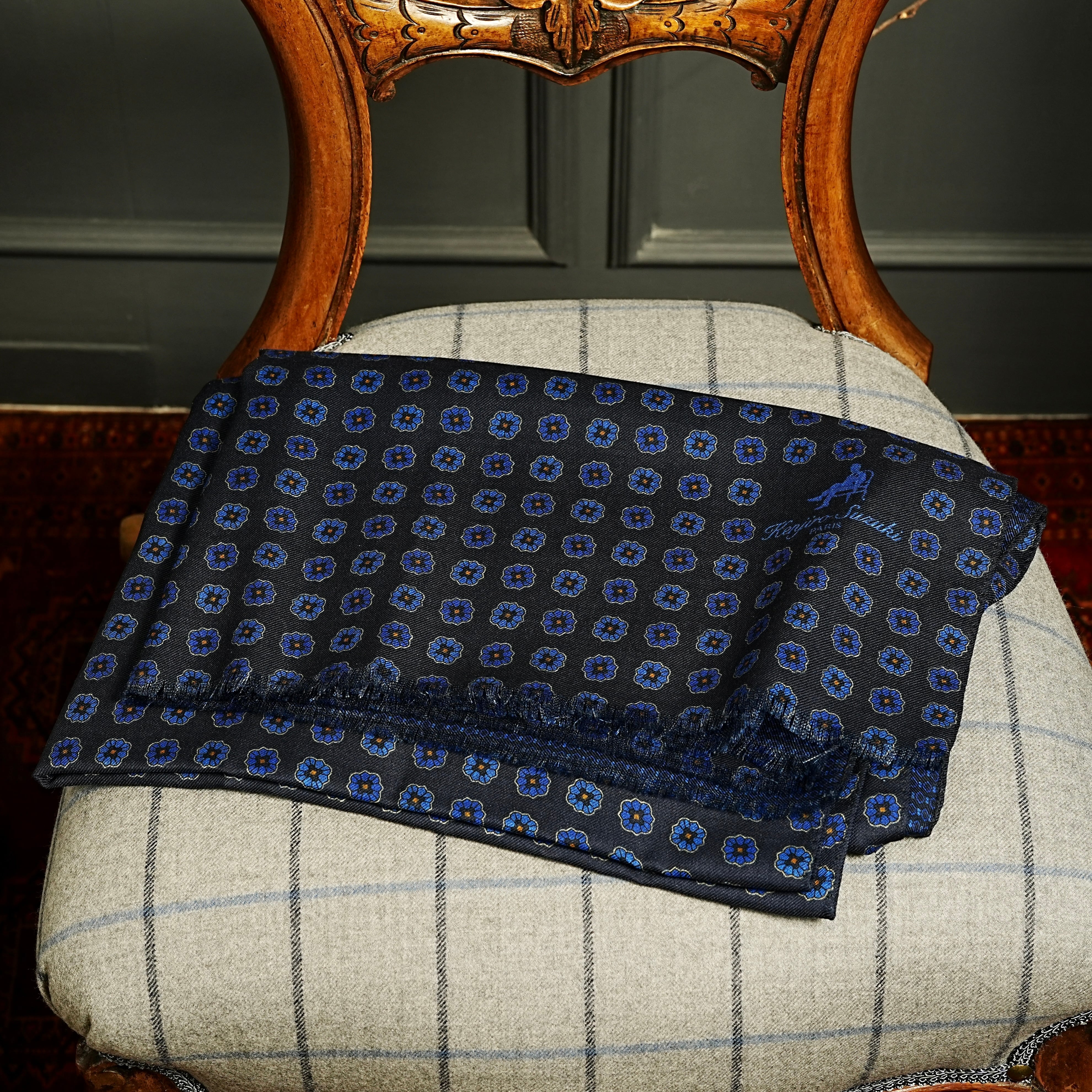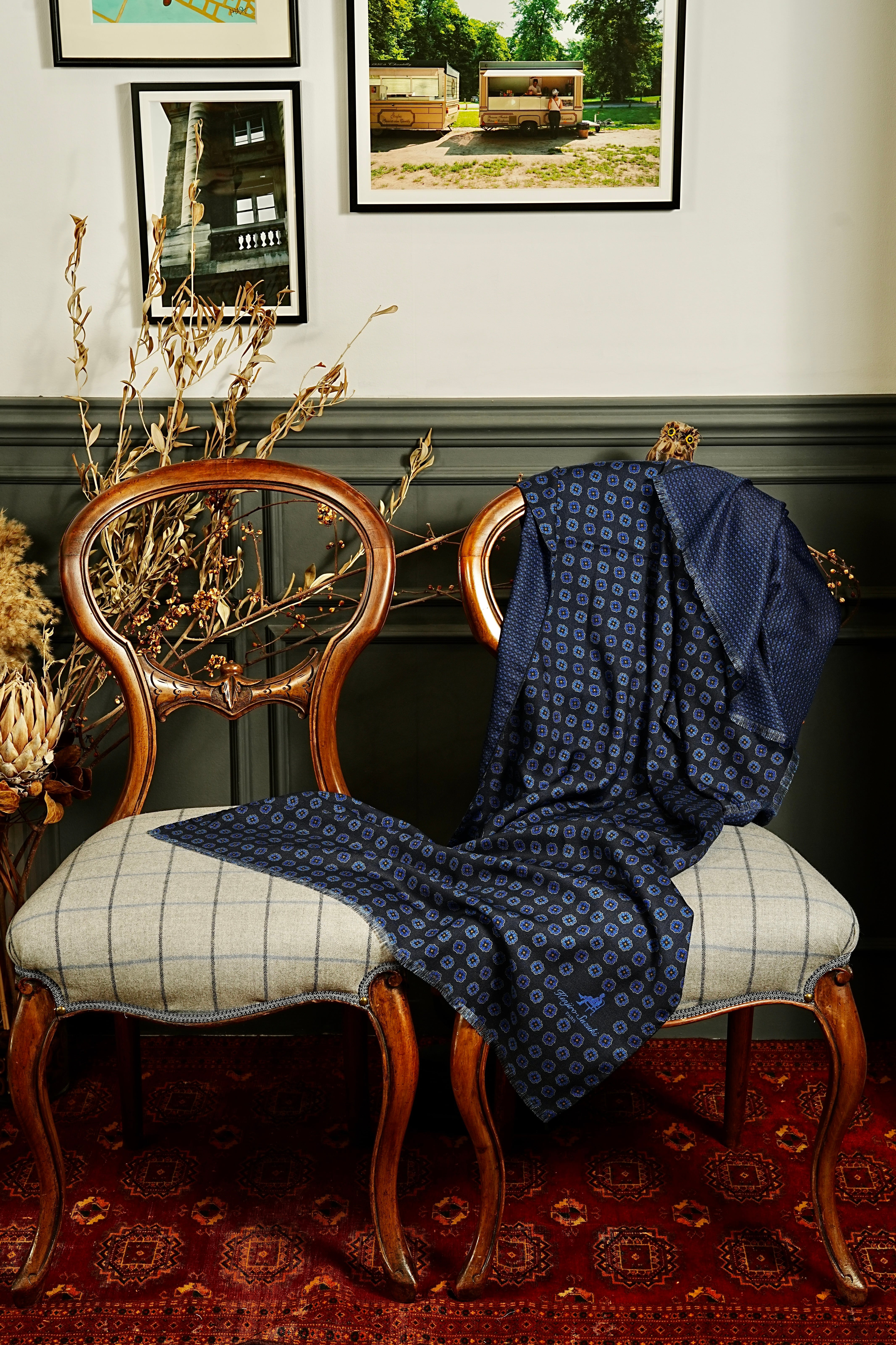 ダブルフェイスといっても、こちらは一枚の布に両面プリントされています。日本のアパレル関係者が見たところ、『よく反対側に透けないな、日本じゃなかなか出来ないよね..』と驚いていました。こちらはイタリア製ですが、ネクタイ、ストール、ポケットチーフ類のクオリティの高さは世界でも評価が高いですね。