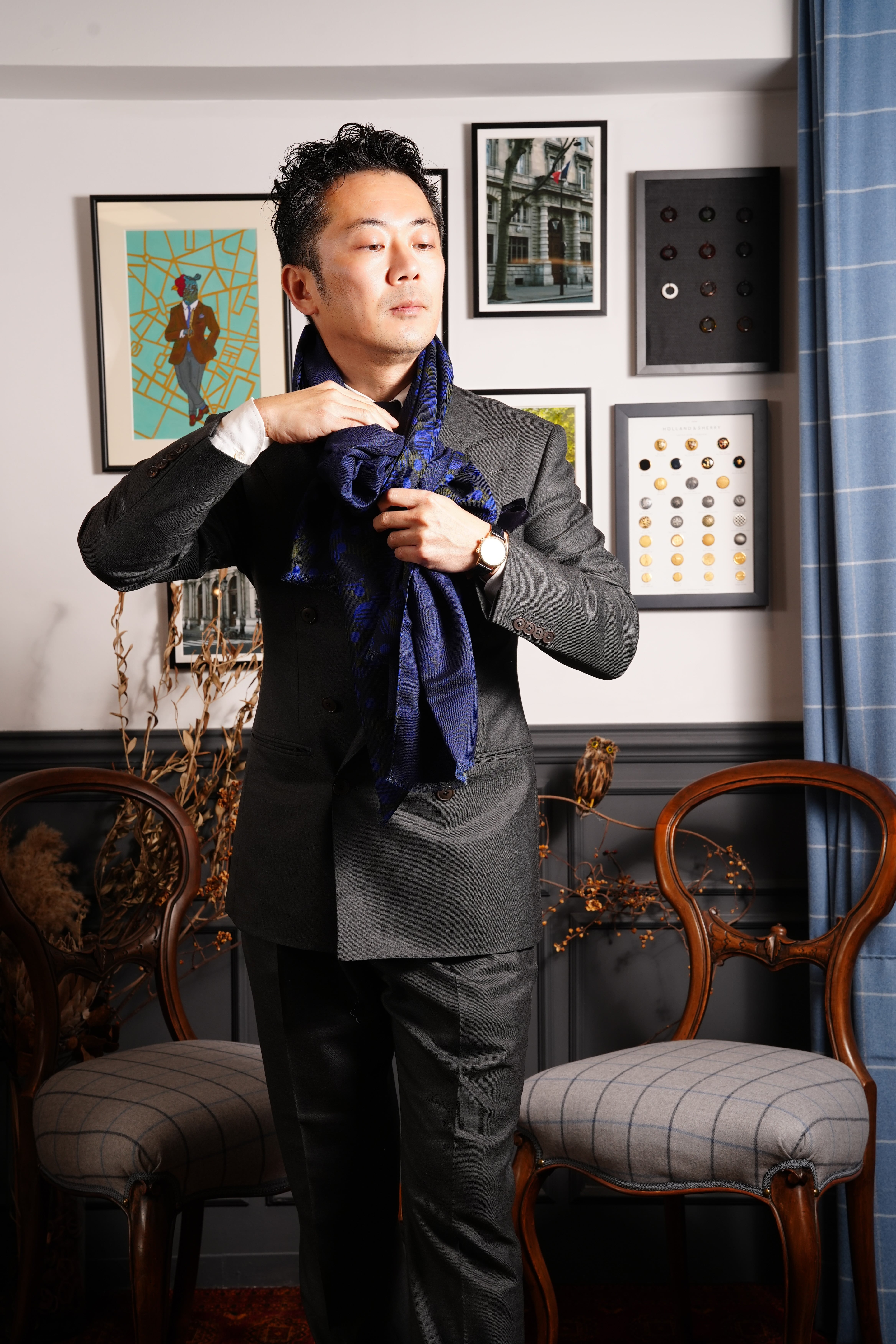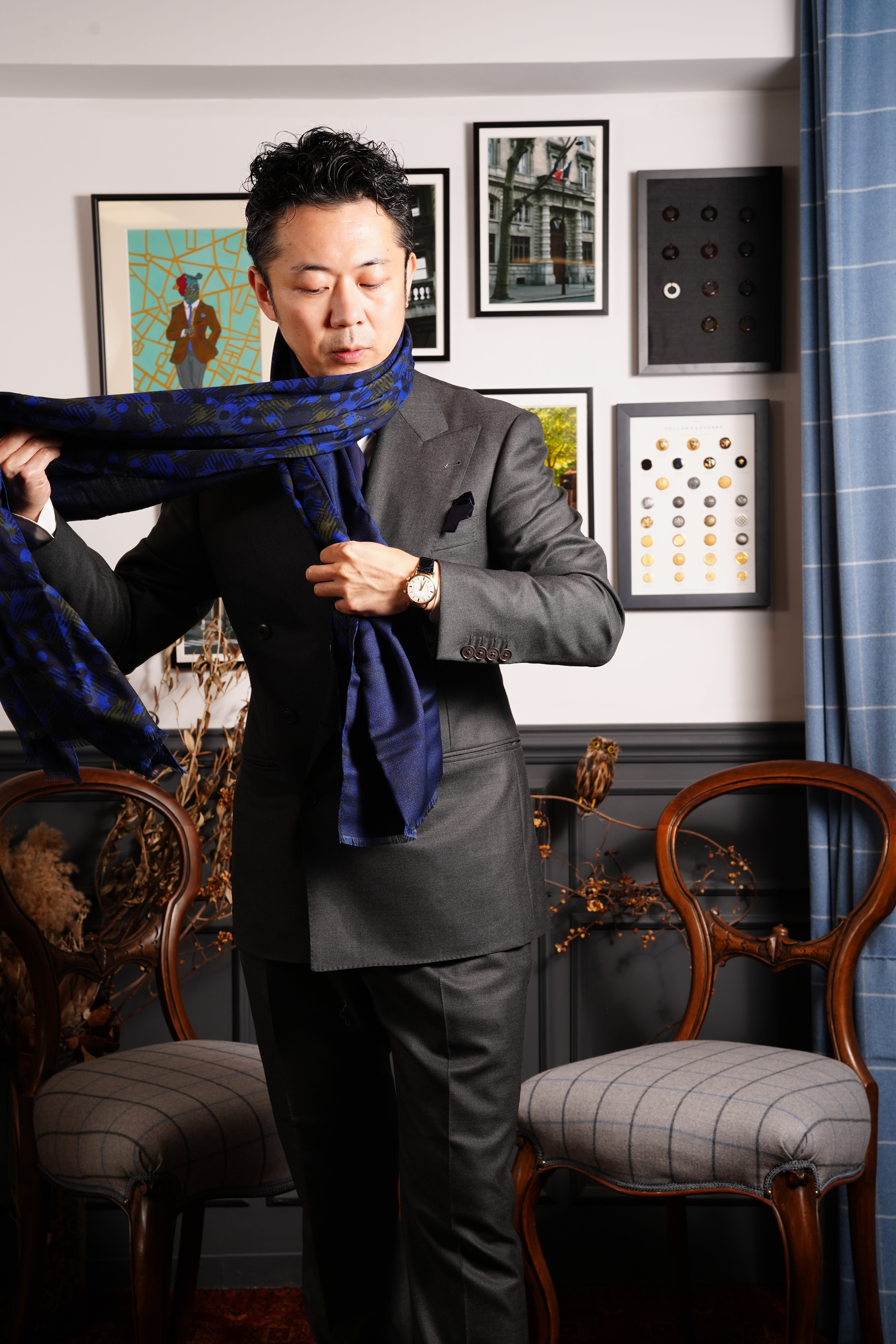 Parisian elegance arises from controlled colour. A grey suit, black shoes, white shirt, and a navy tie already create a chic, restrained foundation; adding this stole introduces a subtle touch of modernity without disrupting the harmony.