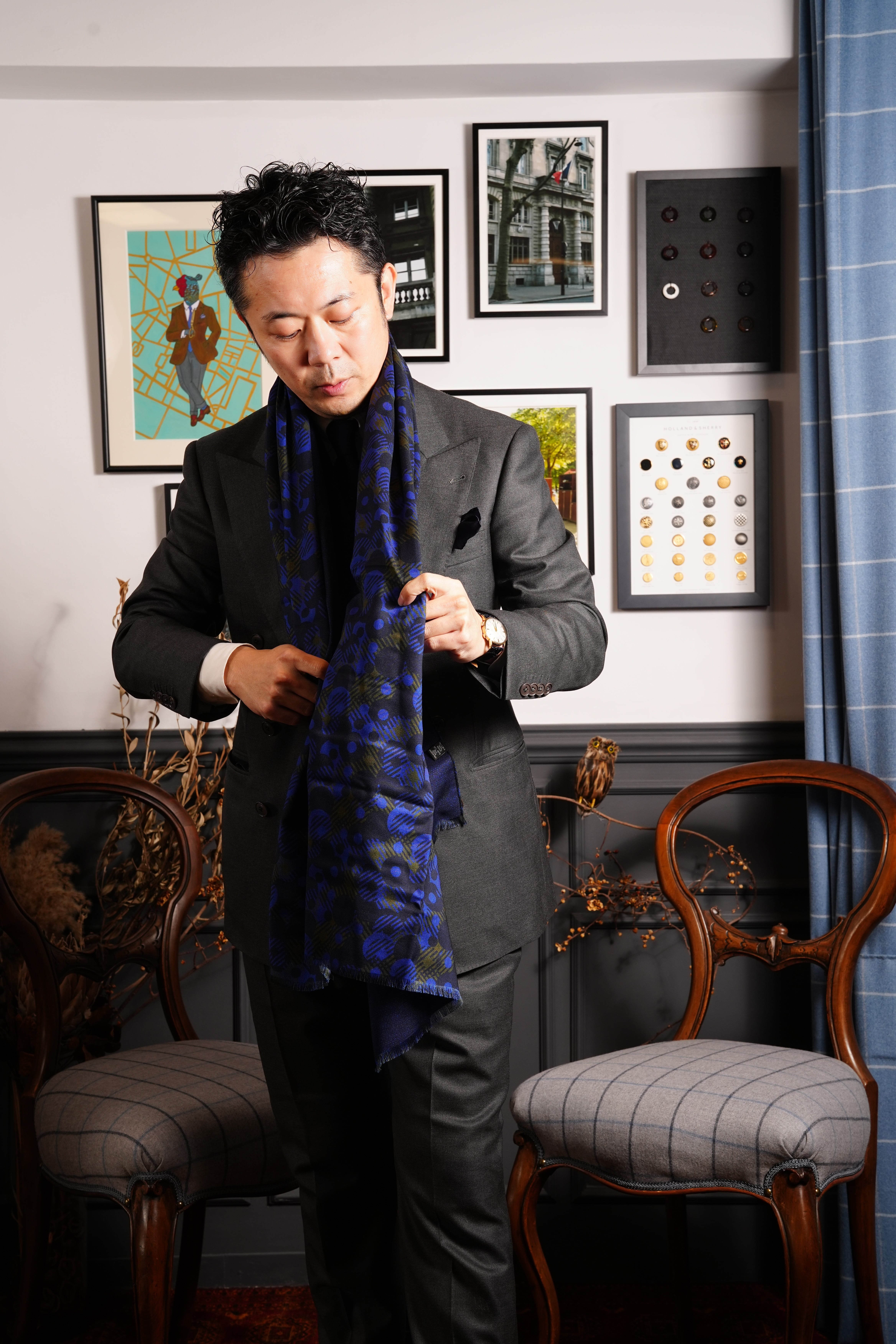 This double-faced piece features a modern navy base with lighter blue and grey accents on the front, while the reverse is nearly solid navy. Its blue palette pairs naturally with navy, brown, and grey jackets. In the photos, it is styled with a grey worsted-flannel suit, where the brighter blue detailing instantly lifts the look when simply draped around the neck.