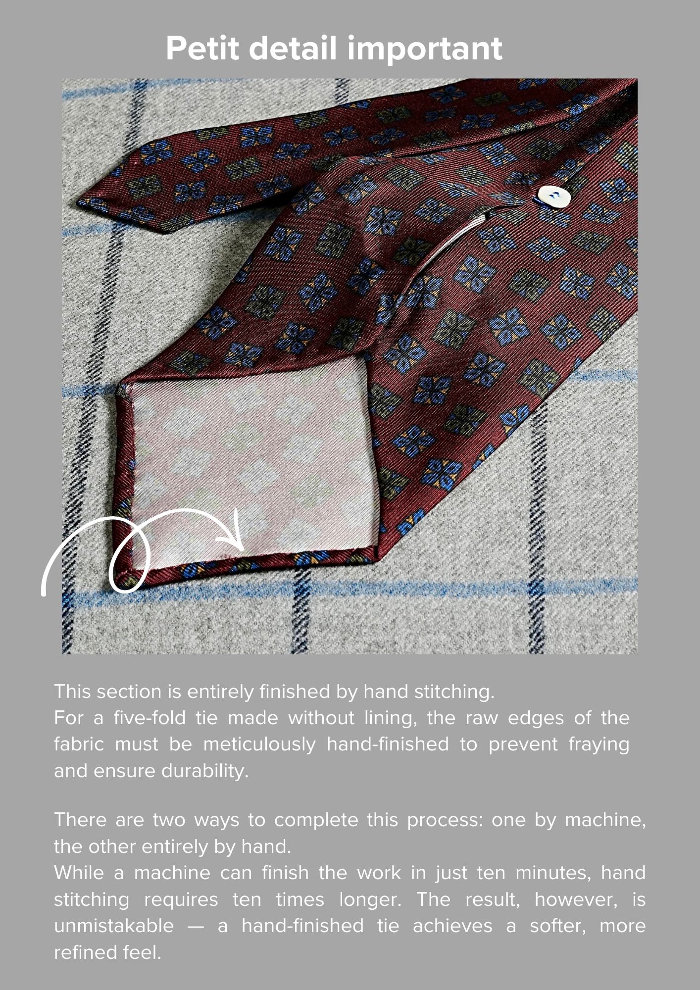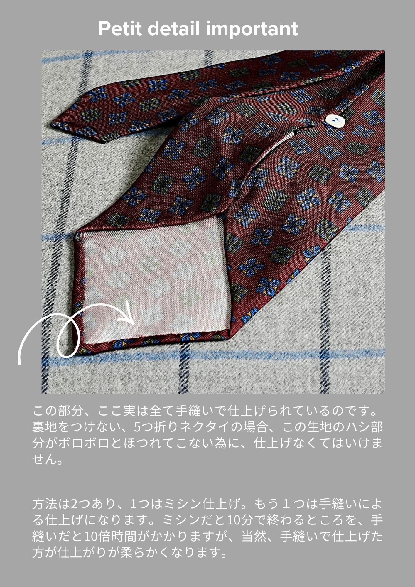 KENJIRO SUZUKI Parisのネクタイは、一般的なジャガードタイよりも薄く、裏地なしの5つ折りで軽く柔らかい仕上がり。極薄芯を使い、全て手縫いで作られているため、締め心地は格別です。