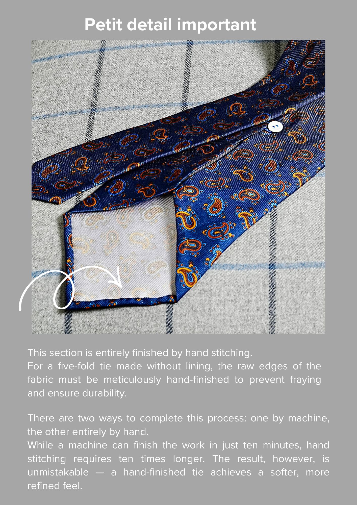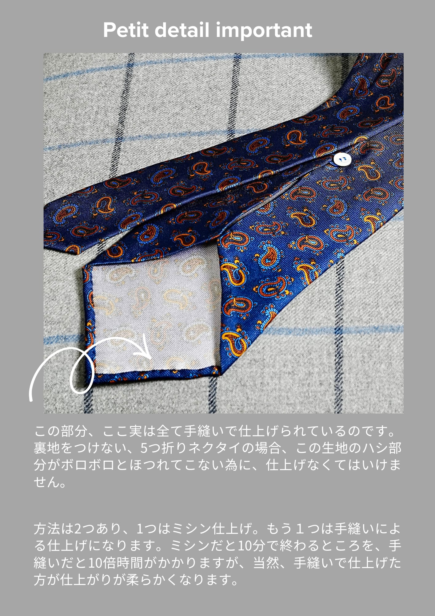KENJIRO SUZUKI Parisのネクタイは、一般的なジャガードタイよりも薄く、裏地なしの5つ折りで軽く柔らかい仕上がり。極薄芯を使い、全て手縫いで作られているため、締め心地は格別です。