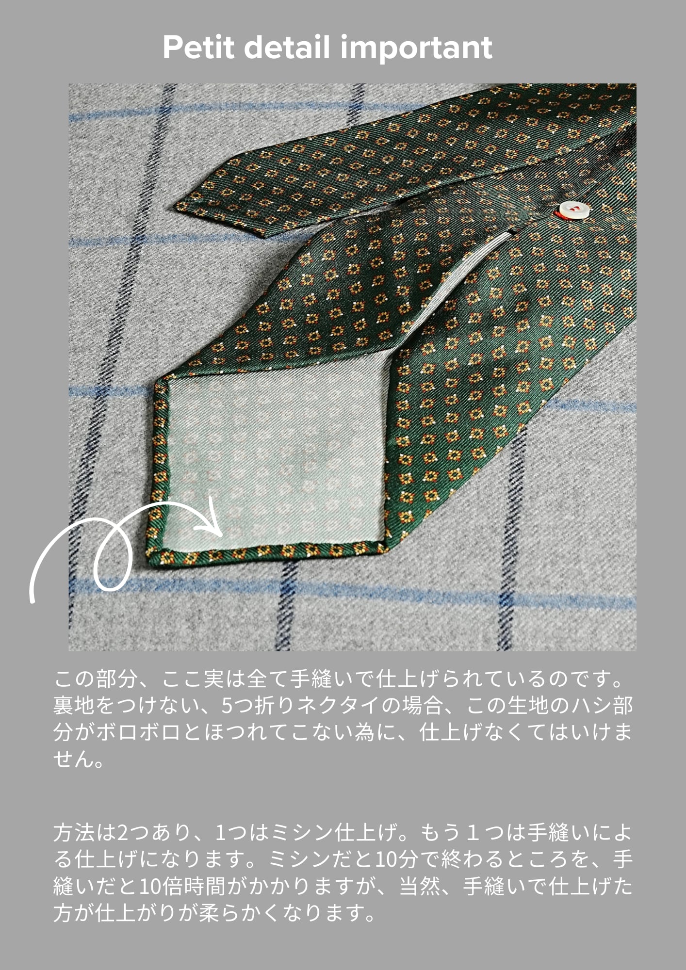 KENJIRO SUZUKI Parisのネクタイは、一般的なジャガードタイよりも薄く、裏地なしの5つ折りで軽く柔らかい仕上がり。極薄芯を使い、全て手縫いで作られているため、締め心地は格別です。