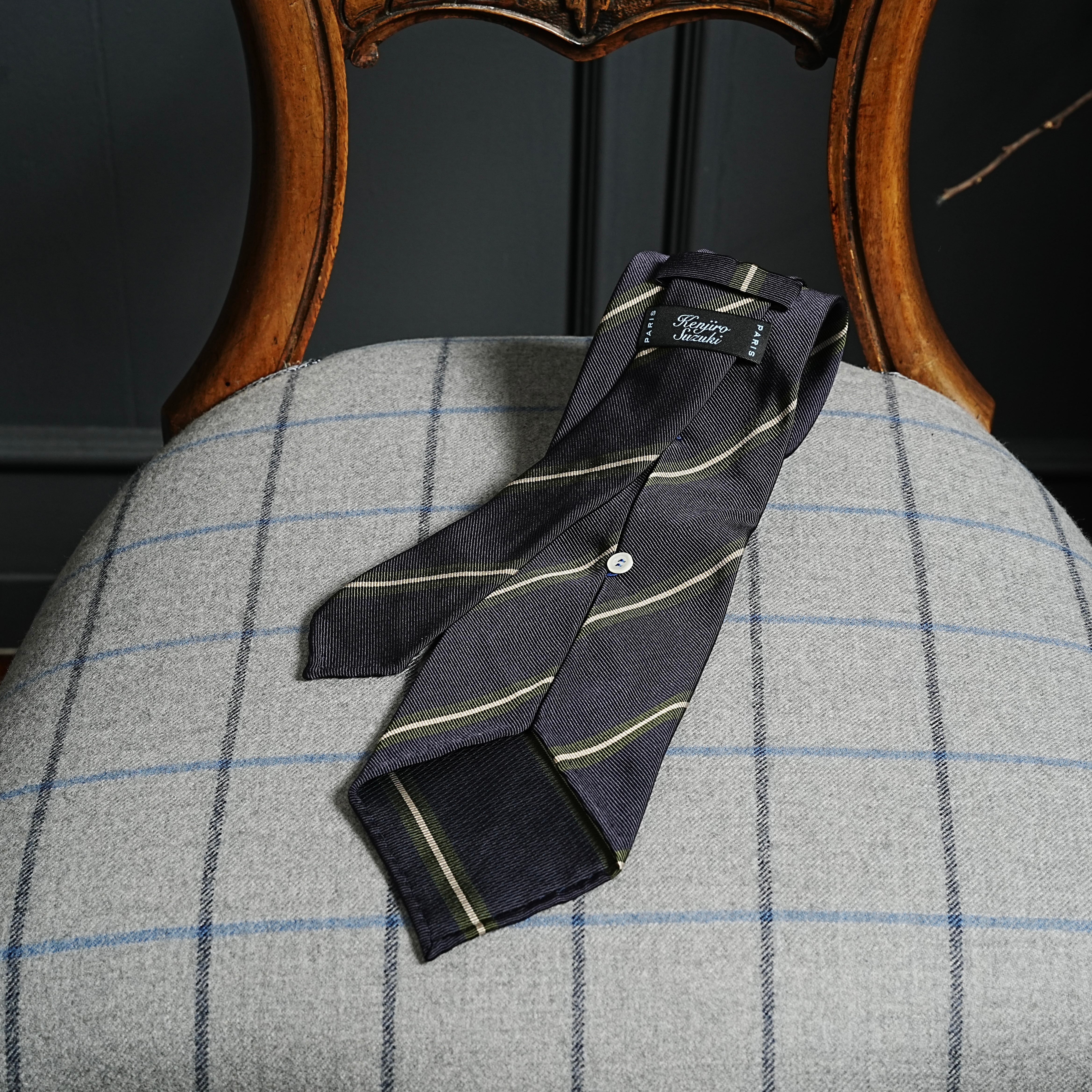 KENJIRO SUZUKI Parisのネクタイは、一般的なジャガードタイよりも薄く、裏地なしの5つ折りで軽く柔らかい仕上がり。極薄芯を使い、全て手縫いで作られているため、締め心地は格別です。