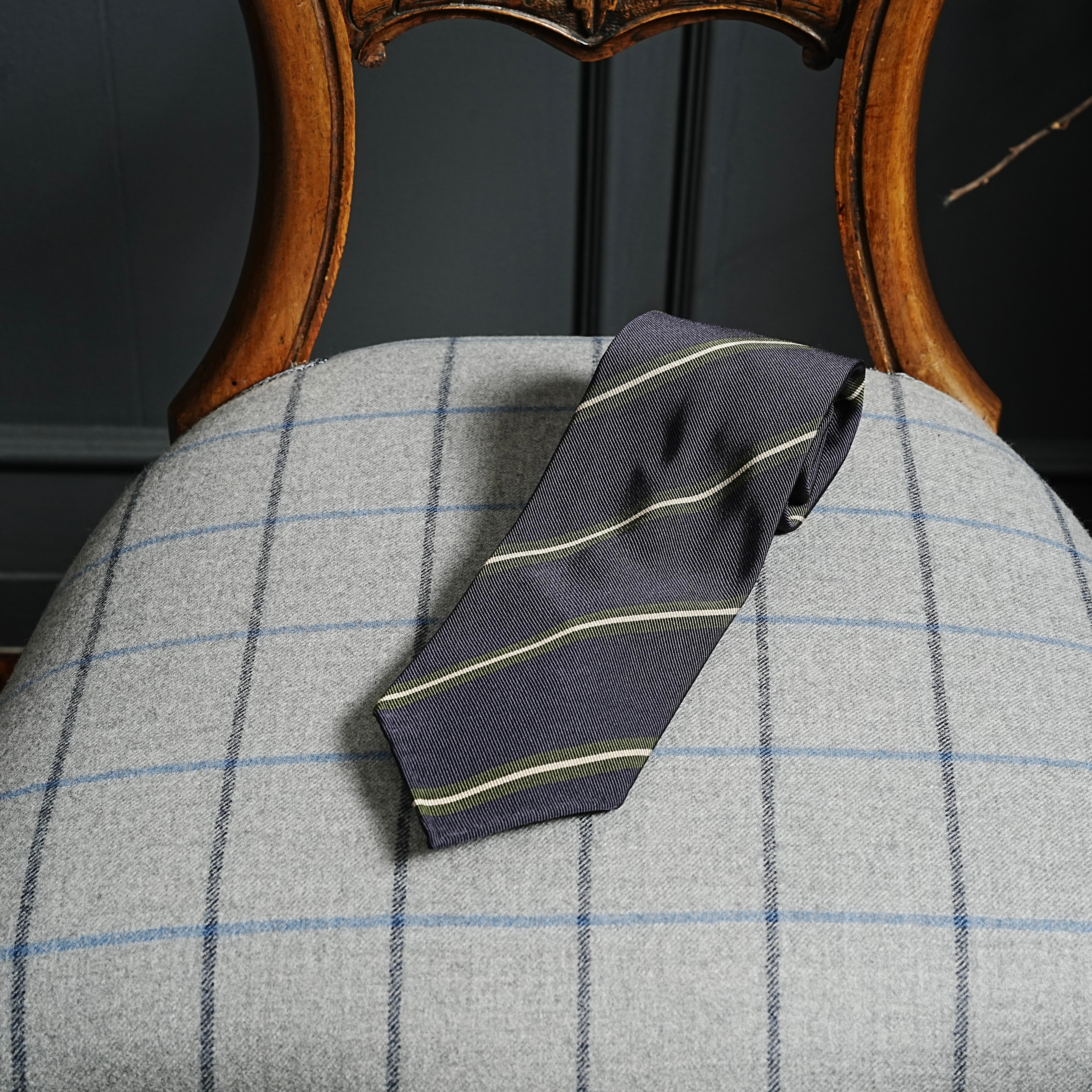 ベースカラーは深みのあるネイビーで、そこにグリーンのストライプが走り、非常に英国的な佇まいを感じさせる一本です。