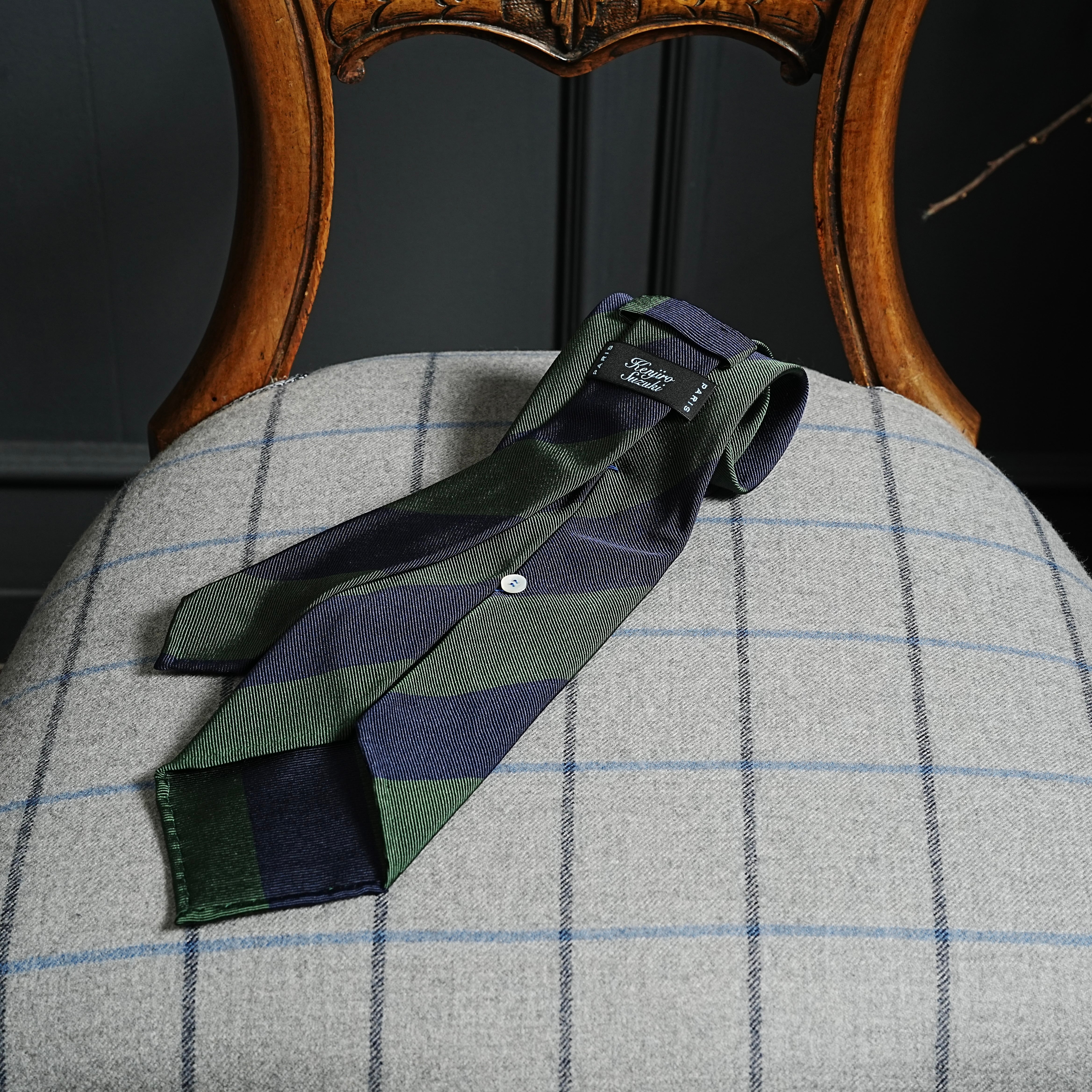 こちらは、ネイビーとグリーンを基調としたレジメンタルタイです。深みのあるネイビーに、穏やかなグリーンを配した配色は、主張を抑えながらも洗練された佇まいを備え、どこかパリのエスプリを感じさせる、フランス的な気品を漂わせます。
