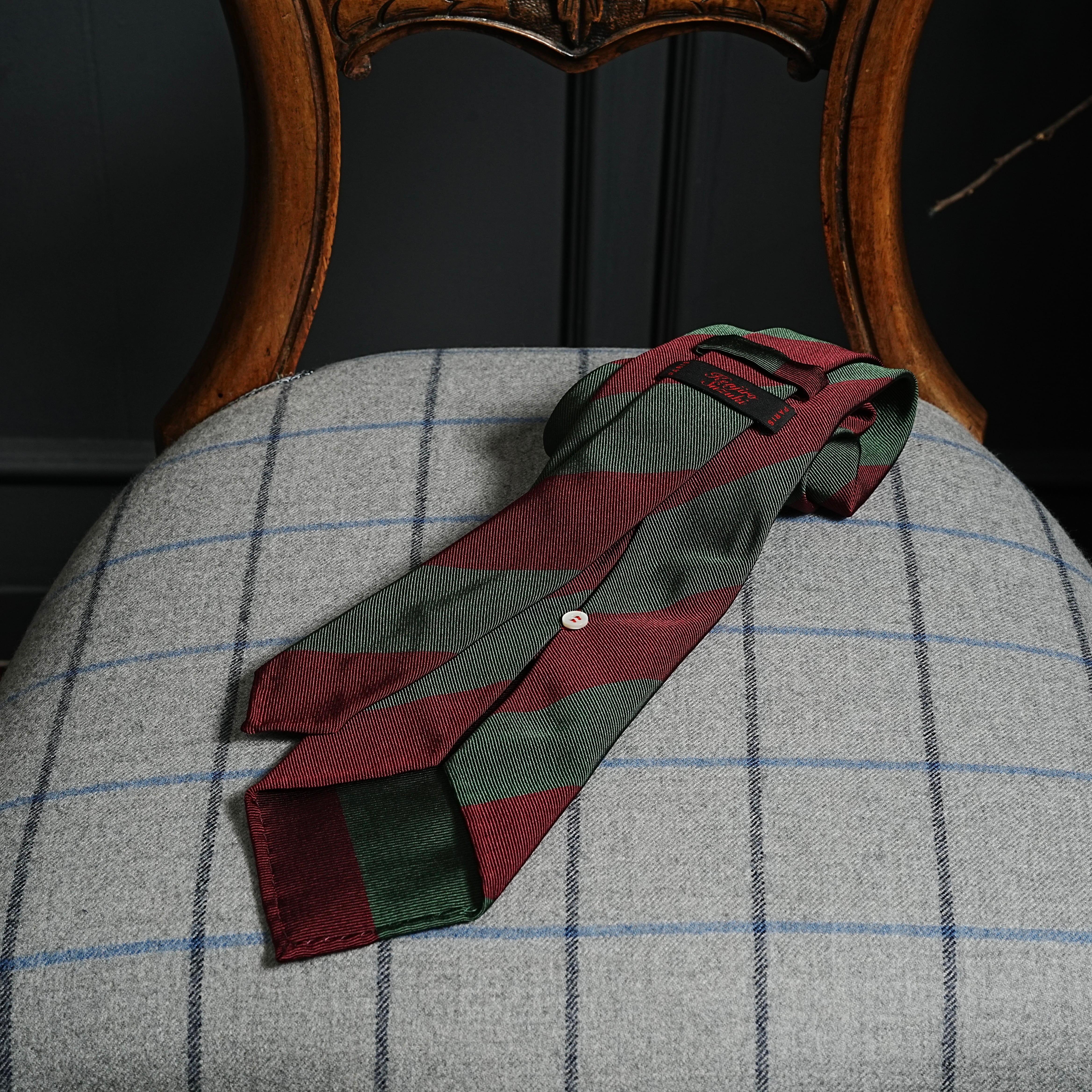深みのあるボルドーと落ち着いたグリーンを配したレジメンタルタイです。コントラストは明確でありながら発色は抑えられており、全体として非常にクラシックで品のある表情に仕上がっています。