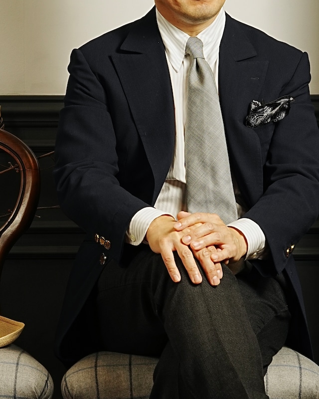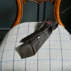 通常ネクタイはシルク100%が多い中、これはウール100%、しかもDrapers super 120Sの生地を贅沢に5つ折りにして作ったものとなります。ウールタイというのは毛足があるいわゆる冬物のものが多いですが、こちらは毛足もないドレッシーなタイ。Super120sの生地は繊維が長く、密度が高く織られている為、タイを締めた時のディンプルが、なんとも言えない美しさになります。