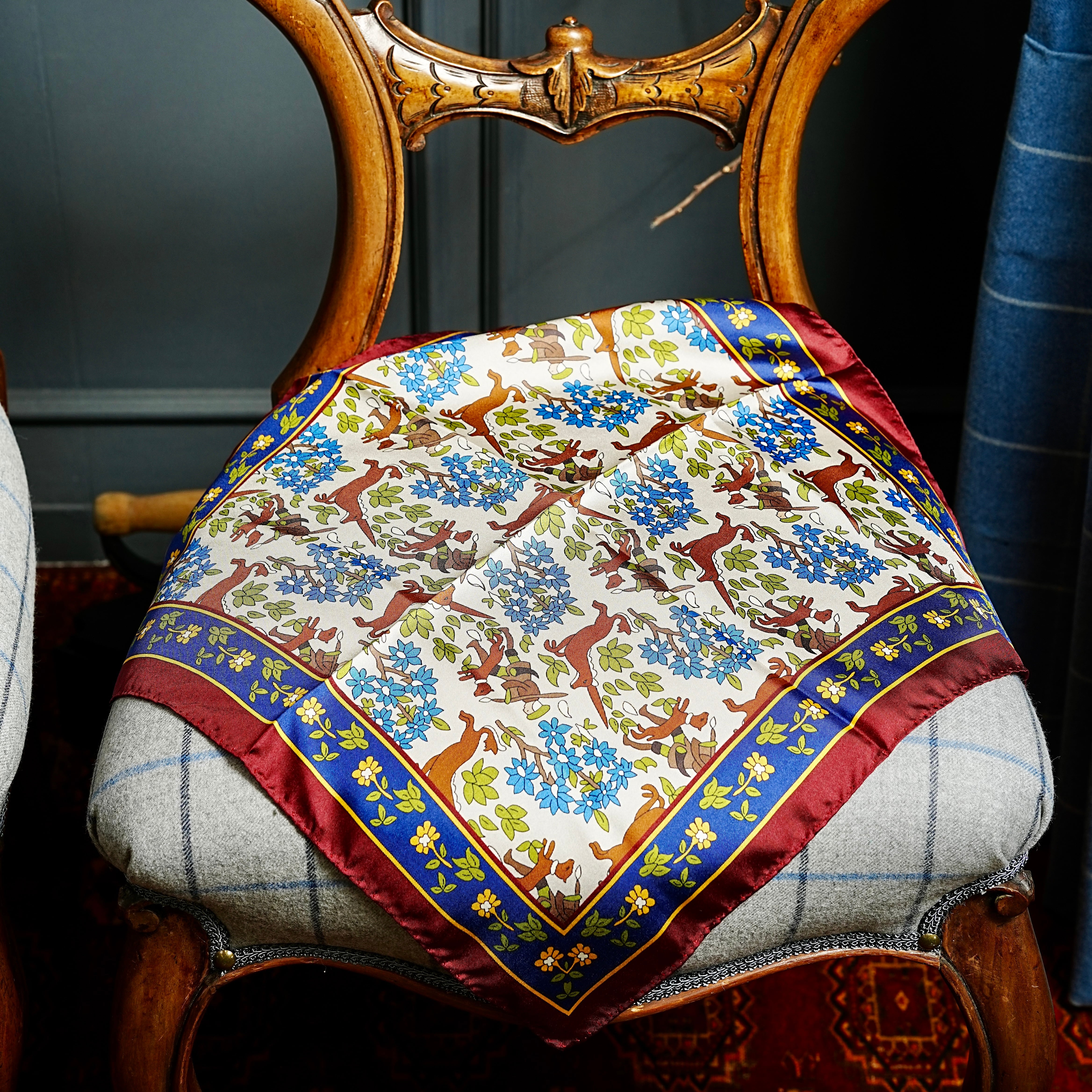 こちらは、鹿と動物、そして狩人が描かれたポケットチーフになります。