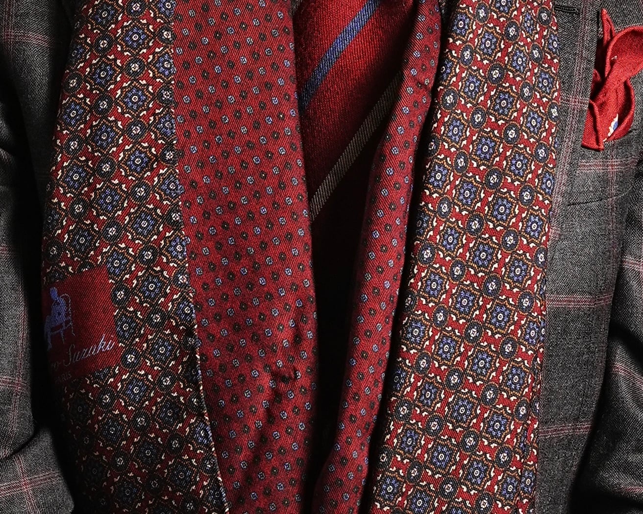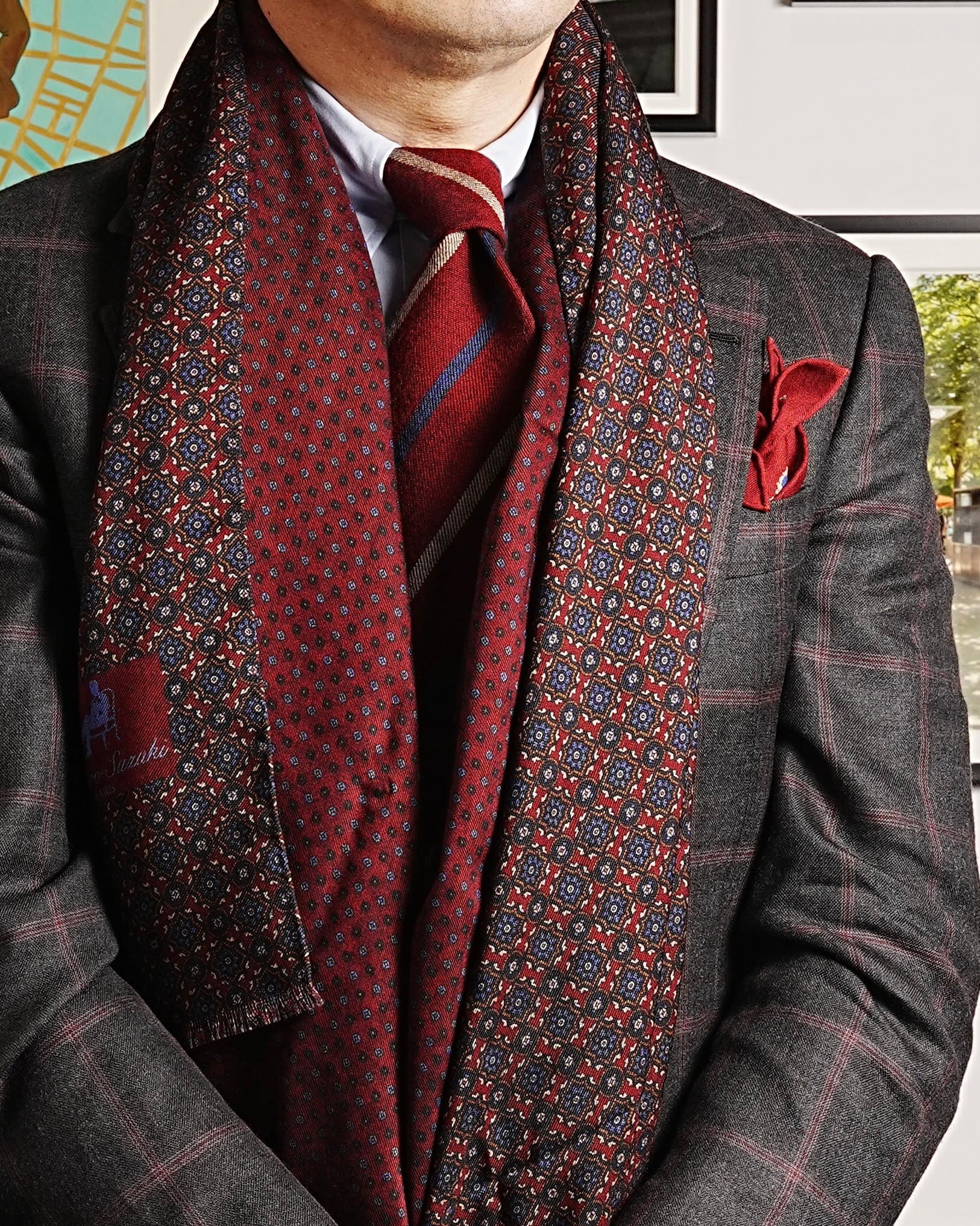 発色が良く、綺麗な色味になりますので、スーツやジャケットスタイルと相性が良く、首元にさっと巻くだけでサマにまる格好良さがあります。
